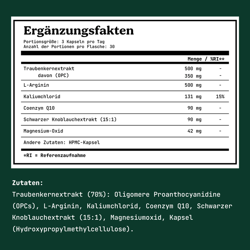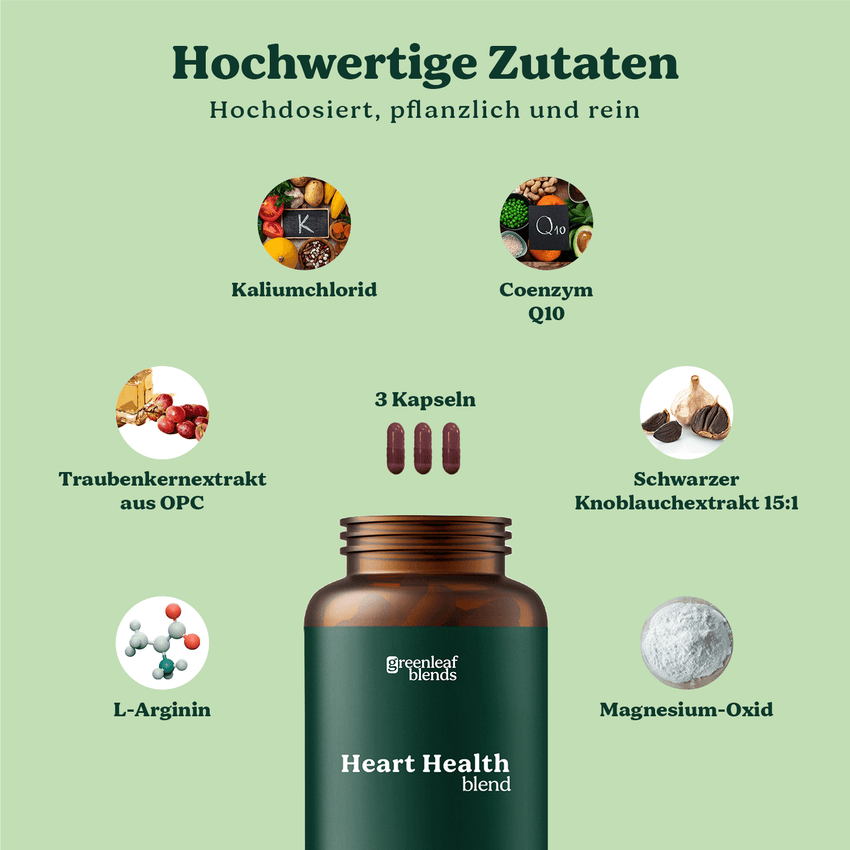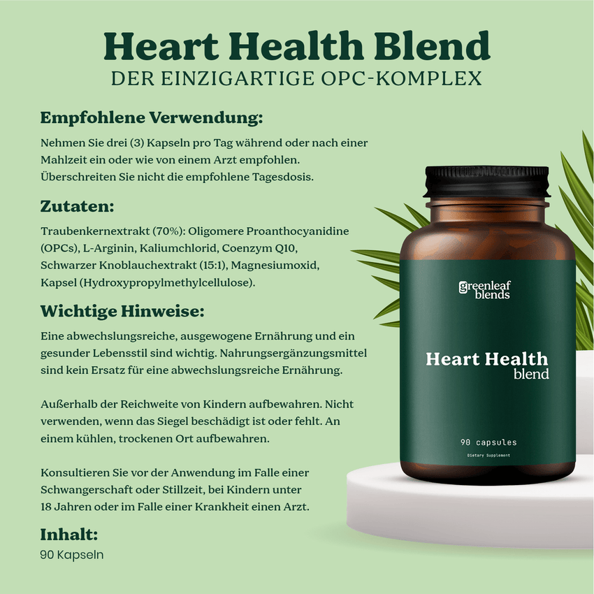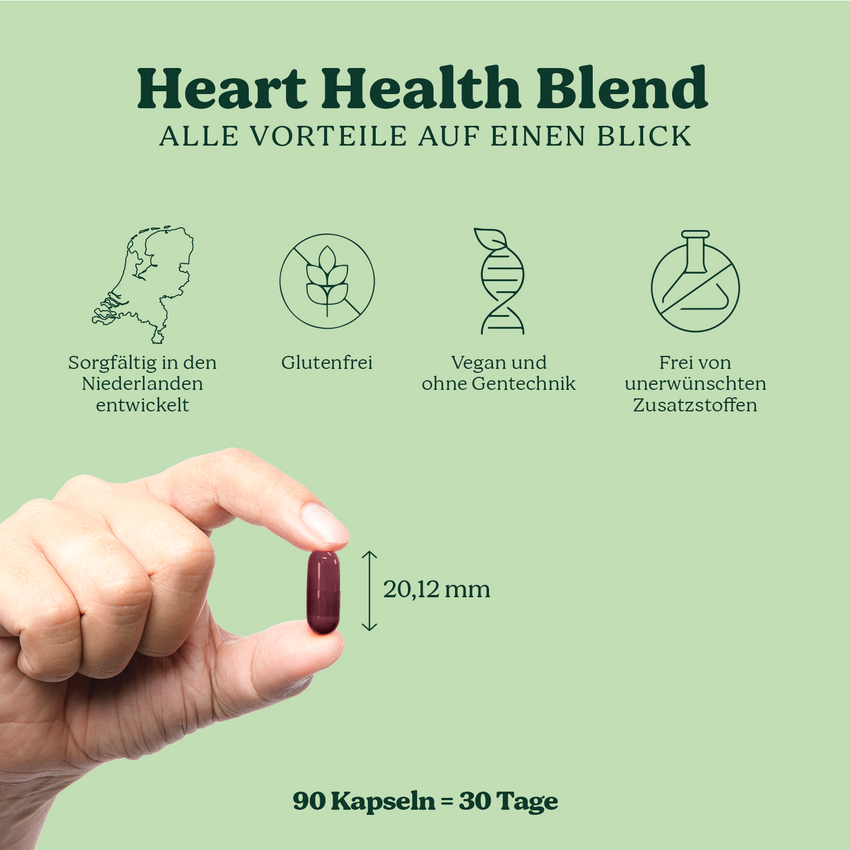 Heart Health Blend combineert hoogwaardige OPC, gewonnen uit handgeplukte Franse druiven, met het bioactieve co-enzym Q10 en wilde zwarte knoflook. De voortreffelijke productie wordt holistisch afgerond met hoogwaardig, organisch gebonden kalium ter ondersteuning van een gezonde bloeddruk. Wij gebruiken druivenpitten afkomstig uit streng gecontroleerde teeltgebieden in Frankrijk. De natuurlijke OPC-essentie uit druivenpitten staat bekend als een krachtige antioxidant en wordt vanwege de veelzijdige werking op veel gebieden toegepast. Deze secundaire plantaardige stof is ook opgenomen in het ontwerp van ons synergetische bloeddrukcomplex, samen met het essentiële co-enzym Q10. Zwarte knoflook krijgt zijn unieke kracht en verhoogde concentratie aan antioxidanten door een duurzaam fermentatieproces, waarbij temperatuur en luchtvochtigheid zorgvuldig worden gecontroleerd. Door het daaropvolgende, uiterst zachte extractieproces bereikt Heart Health Blend een uitzonderlijk hoge dosering knoflook in de vorm van een 15:1-extract. Zo wordt 90 mg (per dagelijkse dosis) verkregen uit maar liefst 1.350 mg van de puurste gefermenteerde knoflook. Onze natuurlijke stoffen worden altijd onderworpen aan de strengste controles via onafhankelijke laboratoriumtests om de hoogst mogelijke kwaliteit te garanderen. De focus ligt op maximale zuiverheid, duurzaamheid en natuurlijkheid in elk product, zonder genetische manipulatie of dierproeven. Daarom bevat Heart Health Blend geen ongewenste toevoegingen of kleurstoffen, maar alleen doordachte combinaties van natuurlijke stoffen in een uiterst zuivere en veganistische vorm.