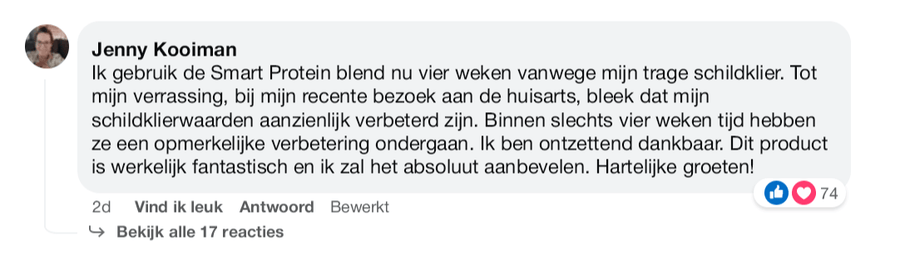 Op aanraden van mijn huisarts nam ik de Smart Protein blend voor ondersteuning bij mijn schildklierproblemen en ben zeer onder de indruk van de uitkomsten. Binnen enkele weken was er al een merkbare verbetering en voelde ik me vitaler. Nu, na vijf maanden gebruik, is mijn gezondheid significant vooruitgegaan. Ik ben ontzettend blij dat ik de keuze heb gemaakt voor Smart Protein blend en zou het iedereen aanbevelen die zijn schildklierfunctie wil verbeteren. Groet, Peter.