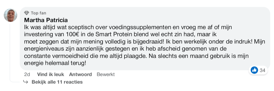 Al jaren kamp ik met chronische vermoeidheid. Sinds ik de Smart Protein Blend gebruik (nu 3 maanden), voel ik me veel fitter. Ik merk zelfs een groot verschil als ik het een dag vergeet. Dus ik blijf het zeker gebruiken!