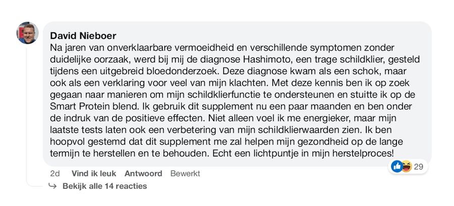 Het gebruik van de Smart Protein blend specifiek ontwikkeld voor mensen met een trage schildklier heeft een revolutionaire impact op mijn leven gehad. Voorheen voelde ik me constant uitgeput en leek het alsof ik nooit genoeg energie had om de dag door te komen. Echter, sinds ik enkele weken geleden begon met deze blend, heb ik een drastische omslag in mijn welzijn ervaren. Mijn energieniveau is merkbaar gestegen en over het algemeen lijkt mijn gezondheid sterk verbeterd. Dit product heeft me onverwacht ondersteund in mijn gewichtsverliesreis, waar ik al jaren tevergeefs mee bezig was. De positieve veranderingen die ik heb ervaren dankzij de Smart Protein blend zijn opmerkelijk, en ik ben er zeer enthousiast over. Ik zou het ten zeerste aanbevelen aan iedereen die problemen ondervindt door een trage schildklier. Het heeft voor mij een wereld van verschil gemaakt, en ik ben ontzettend dankbaar dat ik het een kans heb gegeven.